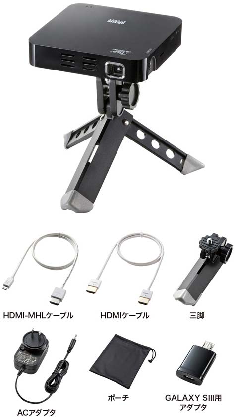 В комплекте с новинкой идёт всё, что показано выше: кабель HDMI, кабель HDMI - MHL, тринога, переходник для Samsung Galaxy SIII, сумка для переноски, адаптер питания и инструкция. Стоимость PRJ-5 не указана.