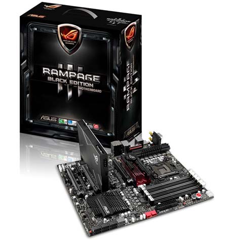 Сразу скажу - большинство новинок относятся к линейке Republic of Gamers, так что всё будет сплошь чёрное и красное, такая у них фирменная цветовая гамма. Начнём с материнской платы ROG Rampage III Black Edition. Она предназначена для процессоров LGA 1366, оборудована гибридом звуковой платы Xonar (с усилителем для наушников) и сетевого контроллера Bigfoot Networks Killer E2100 (эту штуку, названную Thunderbolt, хорошо видно на фото), сделана из высококачественных компонентов и доставит много радости владельцу.