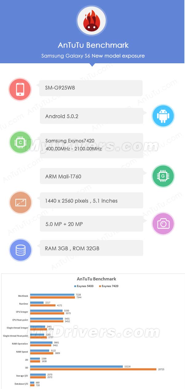 Столь выдающемуся результату Galaxy S6 обязан новейшей 8-ядерной SoC Exynos 7420, использующей поровну ядра Cortex-A57 и Cortex-A53 @ 2.1ГГц. Графическое решение, показанное на скриншотах - Mali-T760, хотя есть вероятность, что в Galaxy S6 будет задействовано Mali-T760MP8. Объём оперативной памяти равен 3ГБ, места для файлов пользователя выделено 32ГБ, камеры обладают 20МП и 5МП (тыл и фронт) сенсорами, а управляется продукт Samsung ОС Android 5.0.2.