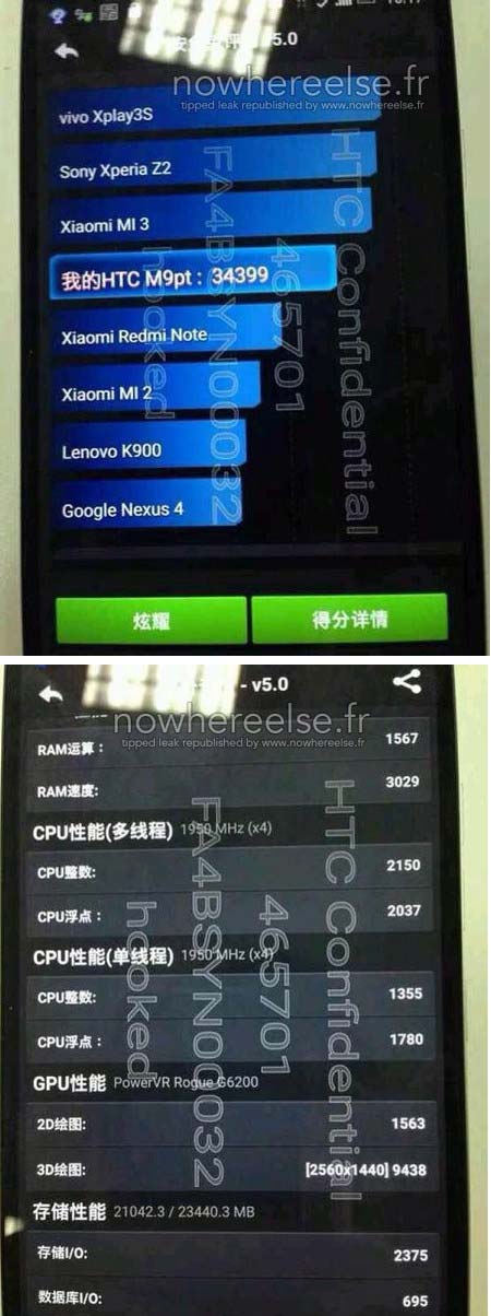 Тестировался агрегат в AnTuTu Benchmark, полученный результат разочаровал даже поклонников творчества HTC - всего 34399 очков. Пока неясно, что за SoC используется в изделии - MT6595 или же MT6795, но благодаря наличию графического решения PowerVR G6200 можно сделать вывод о том, что это последняя названная SoC, хотя указанная частота в 1.95ГГц не является стандартной для этого продукта MediaTek.
