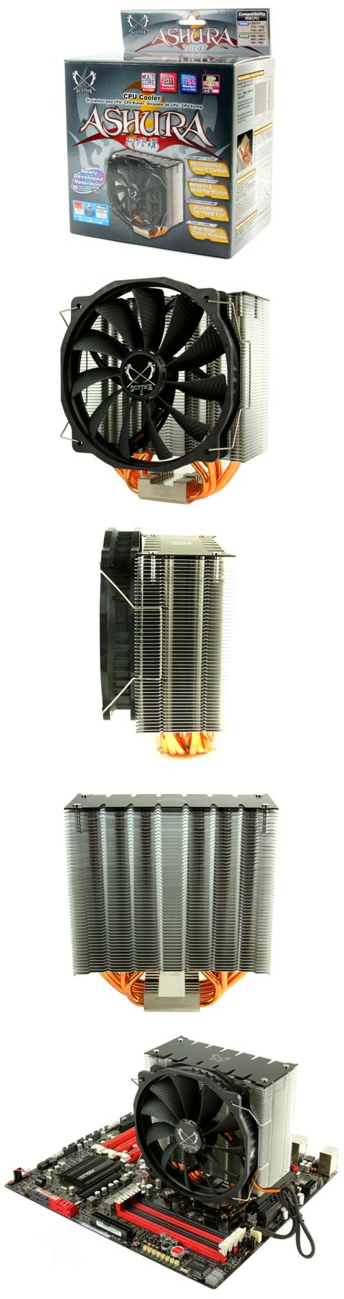 Шума от вентилятора - от 13 до 30.7дБ, воздуха он гоняет от 37.37 до 97.18 кубических футов в минуту. Кулер Ashura совместим с процессорами Intel LGA 775/1155/1156/1366/2011 и AMD AM2/AM2+/AM3/AM3+/FM1/FM2, в нём используется шесть 6мм теплотрубок, и масса алюминиевых пластин в радиаторе, разумеется.