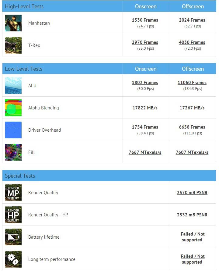 В этот раз планшет протестировали в T-Rex из набора GFXBench 2.7 и Manhattan из GFXBench 3.0, были проведены как onscreen, так и offscreen тесты в 1080p.