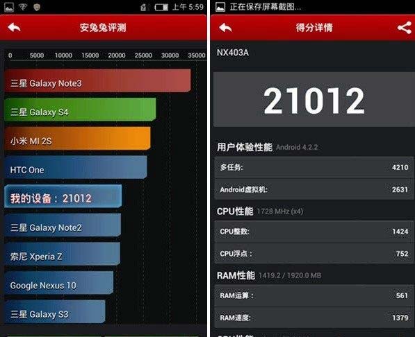 Первым на очередь в AnTuTu идёт смартфон Nubia Z5S, вот результат его выступления: