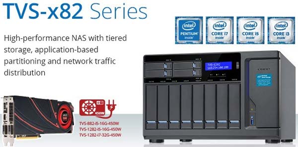 Как и всегда, QNAP обещает достойную производительность, высокую энергоэффективность и широчайшую функциональность своих творений. Аппараты серии TVS-x82 поставляются со встроенными SSD M.2 и слотами для 3.5"/2.5" накопителей, имеют видеовыход HDMI 2.0, способны воспроизводить видео в разрешении 4K при 60 FPS, могут оснащаться видеокартами Radeon R9, питаются от 450-ваттных БП (таковой есть не у всех моделей).