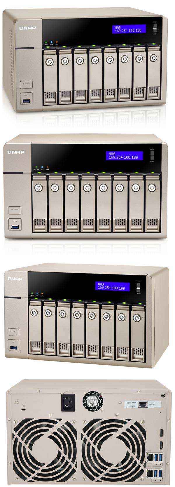 Сегодняшняя новинка именуется TVS-863+, изделие рассчитано на работу с восемью HDD/SSD (3.5/2.5") одновременно, сами накопители в комплект не входят. Основан аппарат на 2.4ГГц 4-ядерной APU от AMD с графикой Radeon, объём оперативной памяти зависит от модели и может быть равен восьми гигабайтам или же шестнадцати гигабайтам, слотов всего два.