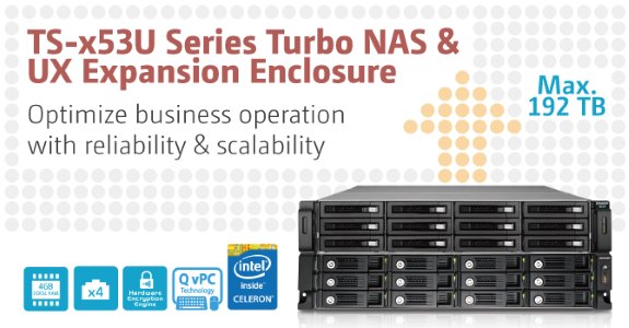 Нам предлагают аппараты серии TS-x53U, устройства имеют в основе 4-ядерные процессоры Intel Celeron (2.0-2.41ГГц), 4ГБ оперативной памяти DDR3L, расширить которую можно до 8ГБ, четыре гигабитных Ethernet порта. Ёмкость изделий семейства может достигать немалых 192 терабайт (TS-1253U-RP + UX-1200U-RP).