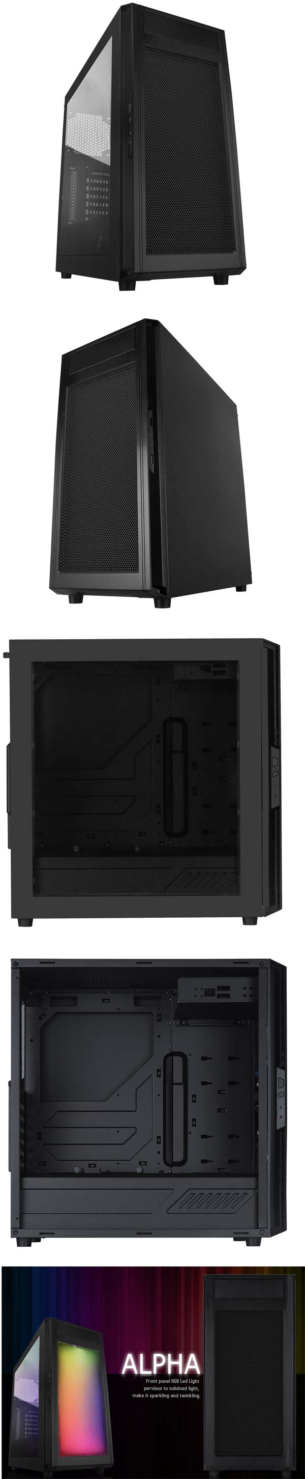 Система охлаждения корпуса Alpha состоит из одного 120мм чёрного вентилятора на задней стенке. При желании можно установить три 120мм или же два 140мм вентилятора с фронта и два 120/140мм на верхнюю стенку. Спереди корпуса расположены RGB светодиодные ленты, цвет которых и эффекты (доступно 22 варианта) можно контролировать при помощи комплектного ИК пульта Д/У. В боковой стенке имеется прозрачное акриловое окно.