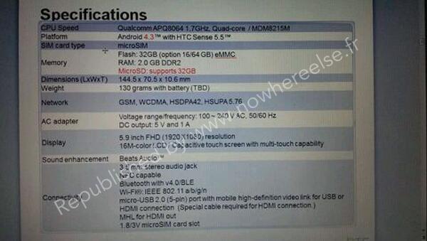 Редактор сайта Nowhereelse.fr запостил на своём аккаунте в твиттере слайд со спецификациями готовящегося к релизу планшетофона от HTC.