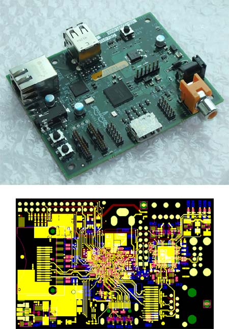 По-сути, перед нами устройство, размерами с кредитную карту, что несёт в себе медийный процессор Broadcom BCM2835 (700МГц), на основе ядра ARM1176JZF-S, аудио и видео решение от Broadcom (с поддержкой OpenGL ES 2.0), плюс поддержку оперативной памяти Package-on-Package (PoP). Кстати - будет как минимум два варианта компьютера, один с 128МБ "оперативки", а другой - с 256МБ.