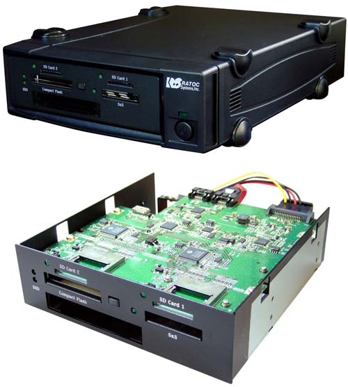 Чем отличается картридер производства Ratoc от прочих изделий, что могут считывать SDXC карты памяти? Ответ прост - у новинки два слота для карт памяти SDXC. Новое изделие будет выпускаться как внешнее USB 3.0 устройство, так и внутреннее, что помещается в 5.25" отсек ПК.