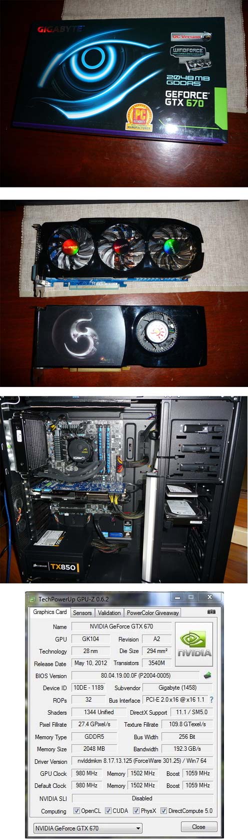 Далее идёт самый интересный вариант GTX 670 - от Gigabyte, оснащённый кулером WindForce 3X. Частоты данной модели, оказавшейся на руках некоторых людей из Австралии, составляют 980МГц по ядру (1059МГц в режиме Boost), да 6ГГц по памяти.