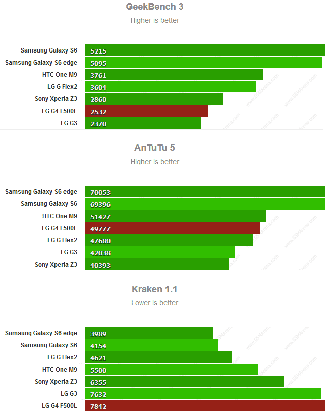 Итогами забегов в бенчмарках делится с нами ресурс GSMArena. Напомню, что новинка от LG основана на шестиядерной (два ядра Cortex-A57 и четыре Cortex-A53) 64-разрядной SoC Snapdragon 808, оборудована графикой Adreno 418, имеет 3ГБ оперативной памяти. По всему - добротный аппарат, но как он выглядит в тестах в сравнении с продуктами конкурентов? Вот ответ: