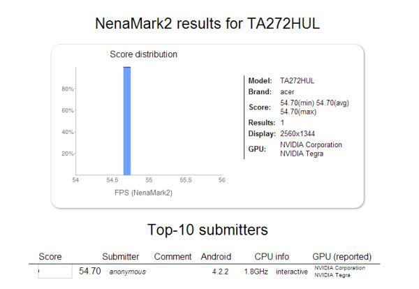 В новинке, пока что носящей кодовое имя TA272HUL, используется довольно шустрая, но не самая популярная SoC Tegra 4 (1.8ГГц). Разрешение экрана изделия составляет 2560x1344, что весьма неплохо для планшета, но всё же не является предметом мечтаний. Ниже показано, как выступил данный девайс, управляемый Android 4.2.2 в бенчмарке NenaMark2: