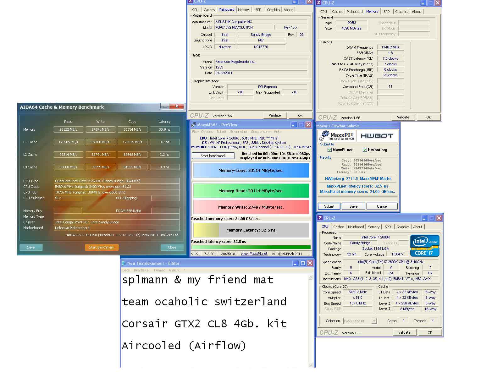 В режиме по умолчанию, данные модули памяти работают на частоте 2250МГц при таймингах 8-8-8-24. splmann заставил их работать, причём используя только воздушное охлаждение, на частоте 2292МГц при таймингах 7-7-6-21 и 1T command-rate. В итоге была достигнуты следующие показатели: