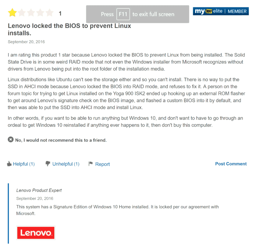 Нам сообщают тревожные вести, уважаемые читатели. На устройствах Lenovo Yoga 900S и Yoga 710S с предустановленной Windows 10 Signature Edition задействован особый soft-RAID режим, не позволяющий установить какую-либо другую операционную систему, например, тот же Linux (а, возможно, и более ранний Windows). На такой странный шаг Lenovo пошла из-за некоего соглашения с Microsoft (об этом было сообщено самой Lenovo, но позже сообщение было заменено другим). Более того - пользователь не может поставить накопители указанных компьютеров в другой режим, в BIOS эти настройки заблокированы.