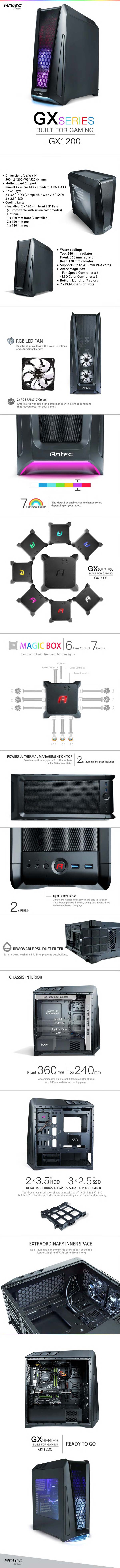 Корпус GX1200 совместим с материнскими платами форм-факторов ATX, E-ATX, Mini-ITX и microATX, шасси обладает размерами 510x510x200мм, семью слотами расширения, двумя отсеками для 3.5" и тремя для 2.5" накопителей. С помощью Antec Magic Box можно менять подсветку корпуса и двух комплектных 120мм вентиляторов.