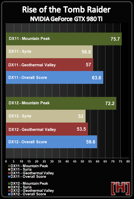 Обязательно посмотрите материал по ссылке выше, ведь там производятся тесты и на других видеокартах, более низкого уровня, т.е. более распространённых. Выводы в тесте весьма однозначны - на данный момент времени DX11 в игре работает быстрее, но дело не в самом API, а в оптимизации драйверов под него, которой в случае с Rise of the Tomb Raider пока и не пахнет.