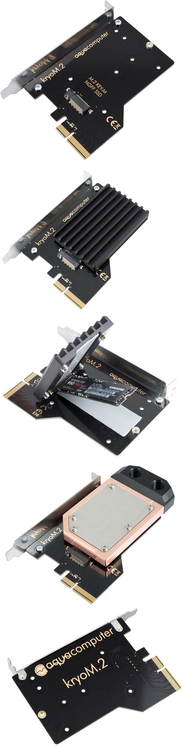 Немцы предлагают нам KryoM.2 - семейство PCIe 3.0 4x райзеров, специально созданных для работы с M.2 SSD. Моделей предлагается несколько - обычная, т.е. без наворотов, с радиатором охлаждения для накопителя M.2 и вариант с водоблоком для M.2 SSD.