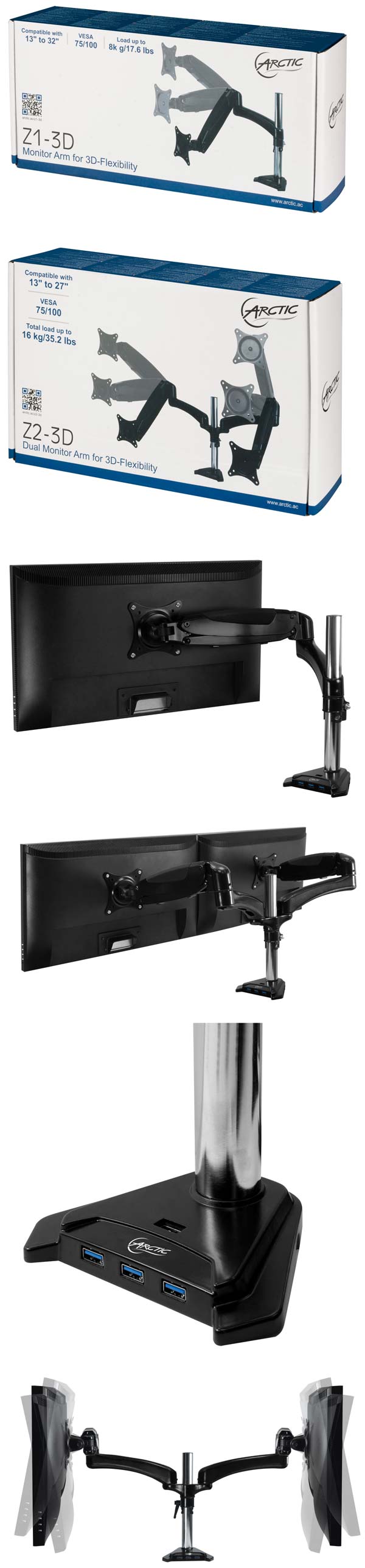 ARCTIC явила миру подставки для мониторов Z1-3D и Z2-3D, являющиеся своего рода продолжателями традиций увидевших свет 5 лет назад устройств Z1 и Z2. Решения крепятся к рабочему столу (способов крепления два - с боку столешницы и сквозное), позволяют вешать на себя мониторы или небольшие телевизоры, лимит по диагонали - 13~33 дюйма, вес - до 8 килограммов, тип крепления - VESA 75x75мм или же 100x100мм. Модель Z1-3D рассчитана на работу с одним монитором, Z2-3D - с двумя.