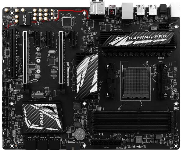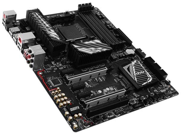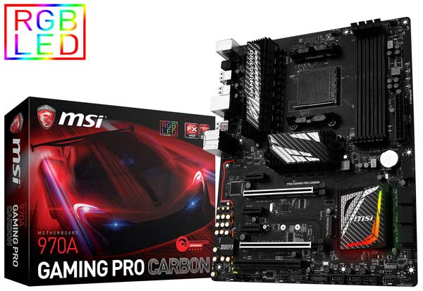 Вторая новинка называется 970A Gaming Pro Carbon, это решение предназначено для процессоров AMD AM3+, построено на связке из AMD 970 и SB950. Питается плата от 24-пинового ATX и 8-пинового EPS коннекторов, VRM решения 8-фазовый. На новинке можно без труда найти два усиленных слота PCIe 2.0 x16 (x8+x8 если заняты оба), трио PCIe 2.0 x1, а также один PCI. Сообщается, что на северном мосту и VRM установлены массивные радиаторы охлаждения.