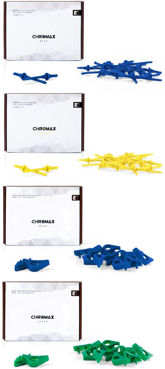 Австрийская Noctua также решила скрасить серые будни пользователей ПК, представив два новых типа аксессуаров, относящихся к линейке Chromax: NA-SAV2 и NA-SAVP1. Все они являются решениями для гашения вибрации вентиляторов, семейство NA-SAV2 сгодится для всех типов вентиляторов Noctua (даже моделей redux), в то время как NA-SAVP1 подойдут лишь для NF-F12, NF-S12A и NF-A14. Цветов доступно немало: красный, синий, зелёный, жёлтый, чёрный и белый.