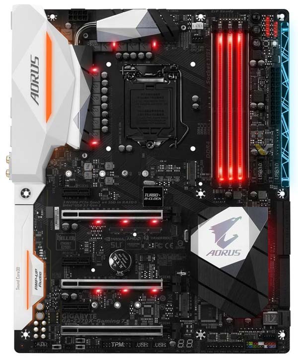 Вчера мы увидели тизер материнских плат от Gigabyte, которые компания планирует выпустить в следующем году под своим брендом Aorus. Теперь же мы посмотрим на одну из новинок, благо стало доступно более детальное изображение Aorus Z270X-GAMING 7:
