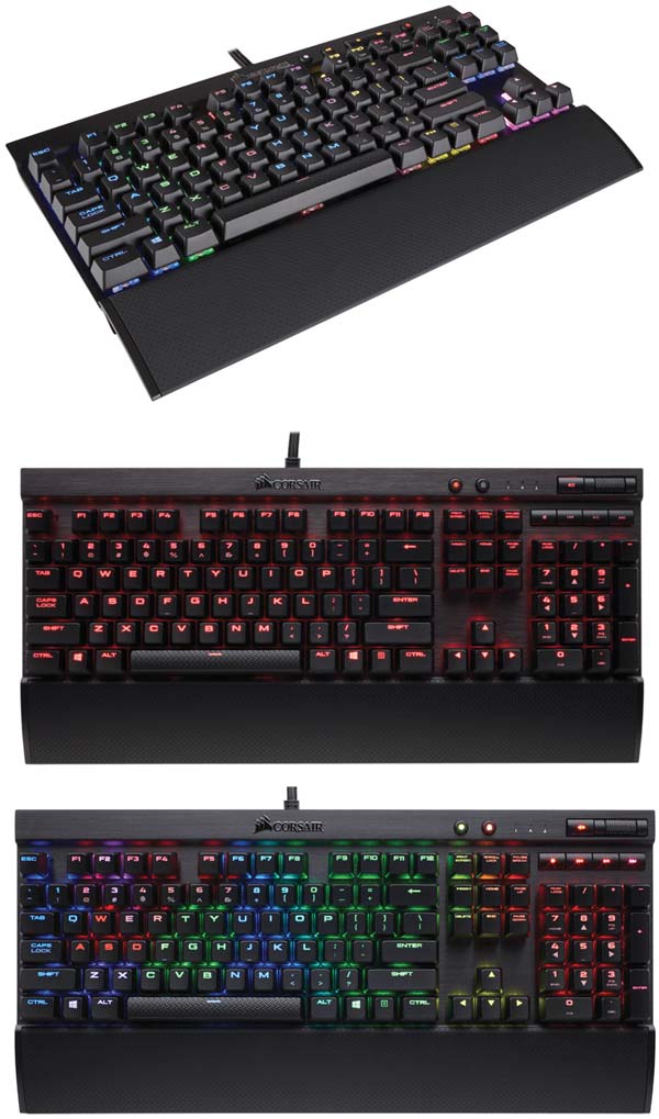 Раз Corsair стала эксклюзивным партнёром Cherry, то она поспешила представить общественности обновлённые новыми переключателями клавиатуры K70 RGB Rapidfire, K65 Rapidfire и K70 Rapidfire. Помимо приобретённых за счёт MX SPEED особенностей, решения обладают 100% анти-ghosting'ом и ролловером при USB подключении, RGB подсветкой (только модели с соответствующими буквами в названии), программируемыми с помощью софта CUE клавишами, отсоединяемой подставкой для кистей рук, мультимедийными клавишами, портом USB для подключения дополнительной периферии, наборами колпачков на клавиши для игр жанров FPS и MOBA.