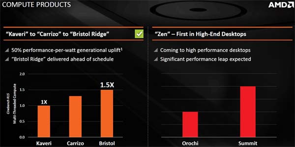 Как известно, к концу года AMD готовит свой главный калибр, им суждено стать процессорам на базе принципиально новой архитектуры Zen. Следующий слайд демонстрирует нам, что процессор Summit Ridge (Zen) вдвое быстрее Orochi (кодовое имя 8-ядерного FX-8350):
