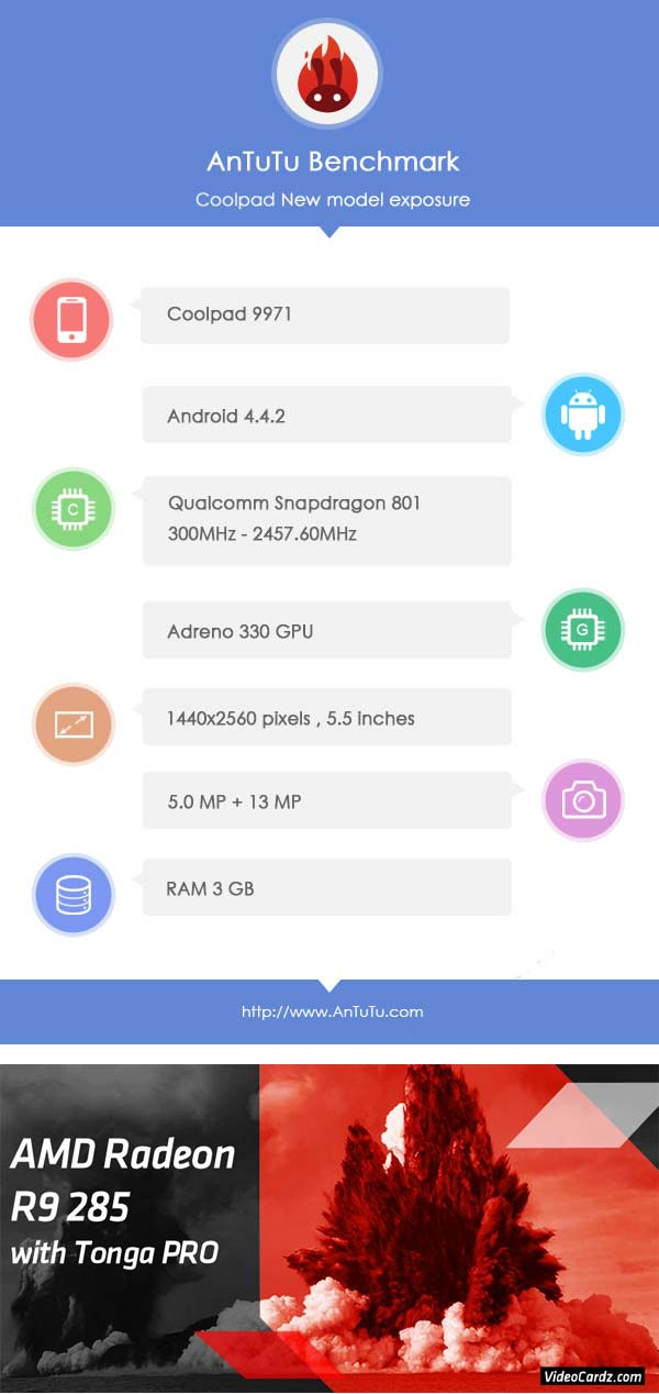 Экран Coolpad 9971 получил диагональ 5.5", его разрешение составляет 2560x1440, объём оперативной памяти равен 3ГБ. Тыловая камера имеет 3МП сенсор, а фронтальная - 5МП, управляется изделие Android 4.4.2. Ожидаемое время релиза новинки - сентябрь этого года.