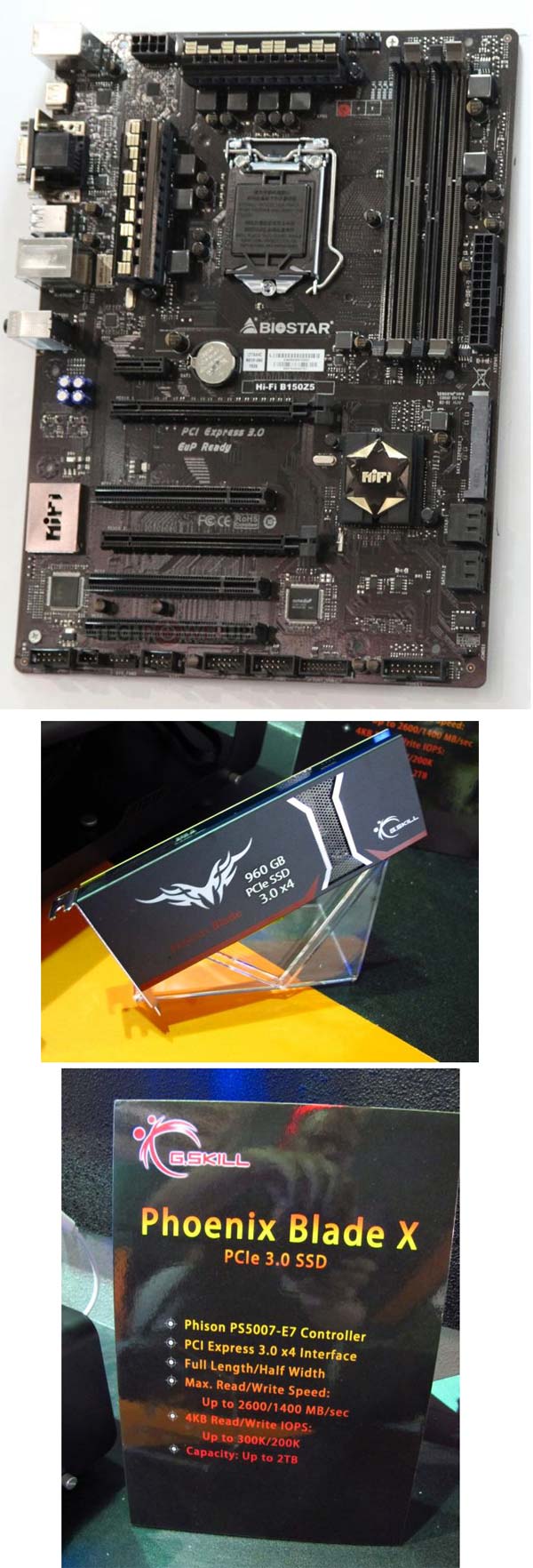 На двух фото выше можно узреть самый быстрый PCIe 3.0 x4 SSD от G.Skill, изделие именуется Phoenix Blade X, поддерживает NVMe, предлагается в вариантах до 2ТБ. Самое приятное - скоростные спецификации агрегата, на чтение SSD показывает 2600МБ/с, на запись - 2400МБ/с, IOPS находится в районе 200 и 300 тысяч (чтение и запись случайных данных 4КБ блоками). Наверняка энтузиасты будут стоять за этим аппаратом очередями, даже не смотря на его заведомо высокую стоимость.