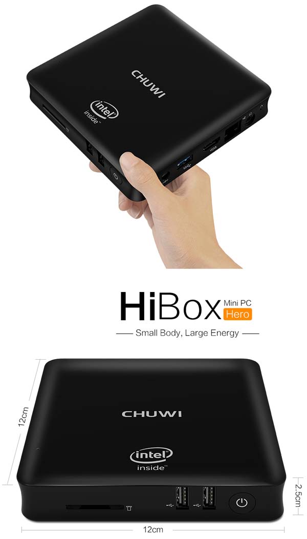 Chuwi HiBox Hero - так называется новый мини-ПК. Устройство основано на процессоре Intel Atom x5-Z8350, имеет 4ГБ оперативной памяти DDR3 и 64ГБ eMMC памяти. Длина устройства составляет 120мм, высота - 25мм. Управляется аппарат сразу двумя ОС: Windows 10 и Android 5.1. В наличии порты USB 3.0 и 2.0, картридер, гигабитный Ethernet, поддержка Bluetooth и WiFi. Решение позиционируется как офисный компьютер или девайс для медийных развлечений (просмотр видео, прослушивание аудио и так далее).