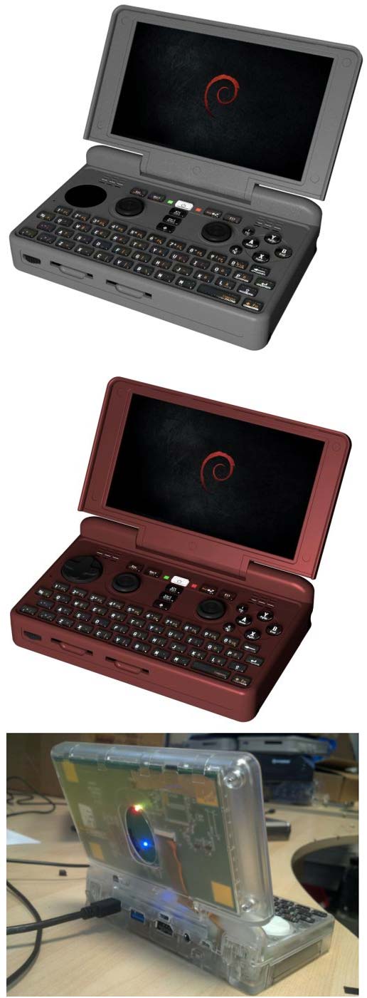 У решения есть QWERTY клавиатура с подсветкой и набор органов управления как у геймпада - D-Pad, аналоговые мини-джойстики, 6 фронтальных и 4 боковых кнопок. Удивительно, но аппарат получил для слота для SDXC карточек, а также слот для microSDXC носителей, с последнего можно загрузить иную ОС, недели чем записанную в eMMC память. Есть у портативной консоли и два порта USB 2.0, порт Micro USB 3.0 и Micro USB 2.0. Опционально возможно заказать и установить 3G/4G/UMTS и GPS модуль.