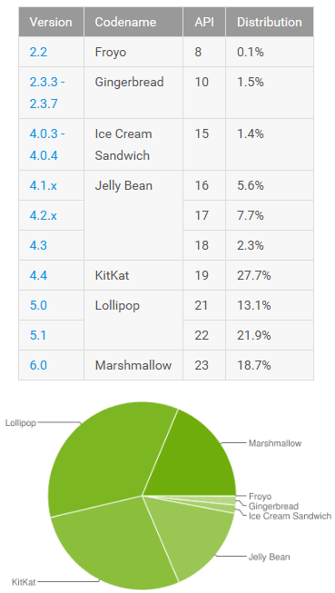 Доля Android 6.x составила 18.7%, что значительно больше августовского показателя в 15.2%. Android 5.0 и 5.1 суммарно занимают 35%, что несколько ниже показателей прошлого месяца (35.5%), Android 4.4 также упал - с 29.2% до 27.7%. Доля Android 4.1-4.3 снизилась до 15.6% с 16.7%, прочие версии можно не учитывать вовсе, хотя Android 2.2 занимает около 0.1% рынка, причём этот смехотворный показатель выше чем доля рынка у новейшей Android 7.0.