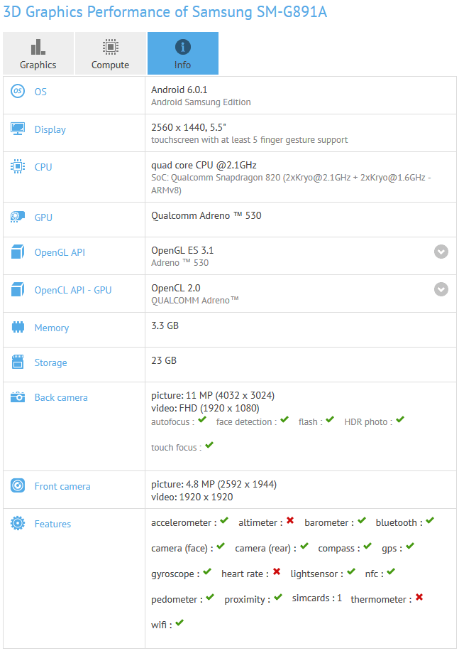В этот раз сведения о фаблете Samsung Galaxy S7 Active пусть и не из официального источника, но довольно надёжного - им стала программа GFXBench. Фаблет получил 5.5" QHD Super AMOLED экран, может похвастаться Snapdragon 820 с графикой Adreno 530 в качестве основы, наличием 4ГБ LPDDR4 оперативной памяти и 32ГБ расширяемой на 200ГБ флеш памяти.
