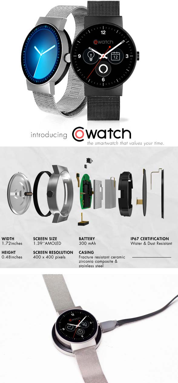 Средства собираются компанией iMCO, дабы свет увидели умные часы CoWatch. Решение основано на некоем 300МГц - 1.2ГГц двухъядерном процессоре, имеют 1ГБ оперативной памяти и 8ГБ флеш памяти, Super AMOLED 1.39" экран с разрешением 400x400, показатель плотности пикселей равен 286 PPI. Корпус часов сделан из сплава стали и циркония, а также керамики.