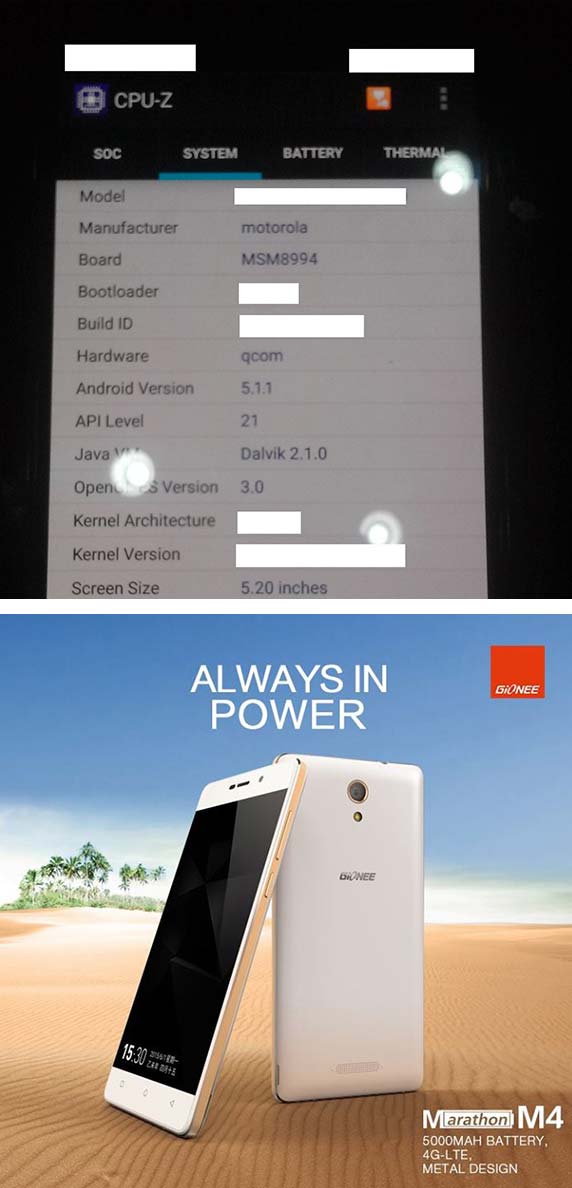 Про Gionee Marathon M4 известно несколько меньше, данный аппарат получит 5" экран с разрешением 720p, 1.5ГБ оперативной памяти, 8МП тыловую и 5МП фронтальную камеры, сможет работать в сетях 4G LTE. Главной и единственной особенностью изделия станет наличие батареи на 6000 мАч (на 5000 мАч, согласно другим слухам).