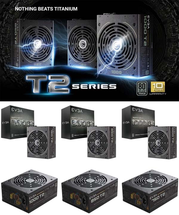 Думаю, многим пришёлся по вкусу блок питания Supernova 1600 T2, теперь EVGA предлагает не менее эффективные БП меньшей мощности, дабы и энтузиасты с меньшим количеством видеокарт в ПК могли порадовать себя новинками, не переплачивая при этом за избыточную мощность. Теперь для приобретения доступны 750, 850 и 1000-ваттные агрегаты, всё с тем же сертификатом эффективности 80 Plus Titanium, одной линией +12V и 10-летней гарантией. Старшая модель выдаёт по ней 83.3А, средняя - 70.8А, младшая - 62.4А, стоят устройства 279, 239 и 219 долларов США.