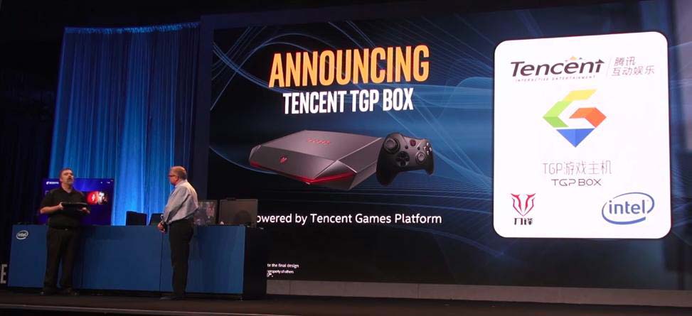 А ниже можно увидеть фото с презентации игровой платформы Tencent Games Platform (TGP Box), первым аппаратом её представляющим стала консоль Haier Box Blade, являющаяся на деле лишь мини-ПК с неизвестными пока характеристиками (основой стал процессор Intel Skylake, иных подробностей о "начинке" девайса раскрыто не было) и управляемый Windows 10.
