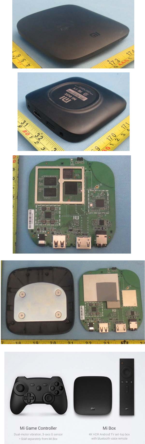 Изделие не имеет пока имени, его называют не иначе как "Xiaomi Mi Box 4K Android TV девайс", по всей видимости это созданный для просмотра видео (в том числе в 4K при 60 FPS) мини-ПК, подключать который следует к телевизору. Аппарат построен на базе SoC с 4 ядрами ARM Cortex-A53 и графикой Mali-450 (предположительно, это Amlogic S905X-H), обладает 2ГБ оперативной памяти и 8ГБ встроенной расширяемой флеш памяти. Устройство дружит с WiFi и Bluetooth, имеет видеовыход HDMI 2.0a, порт USB и выход на наушники.