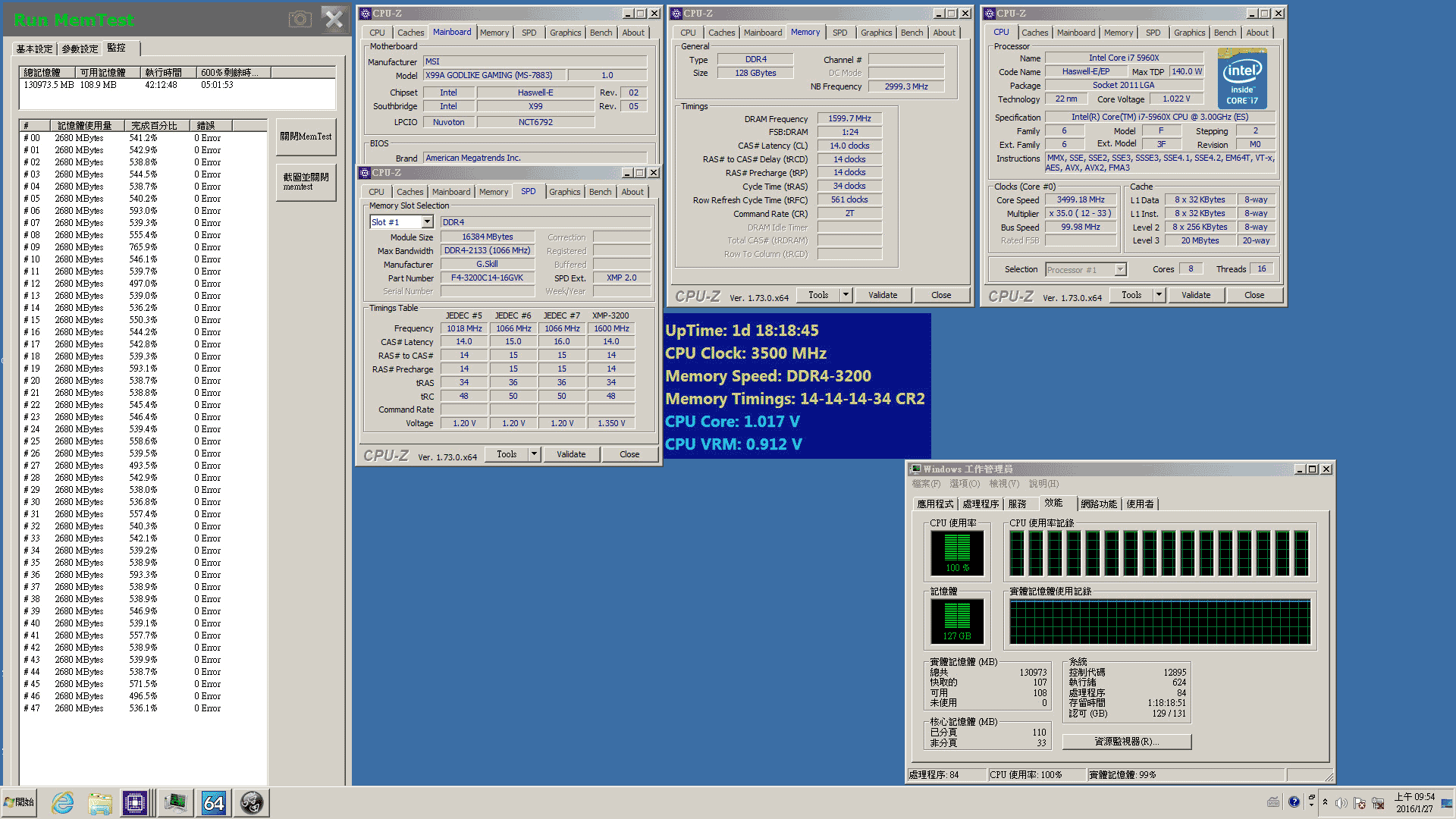 Дабы мы не усомнились в стабильности работы такого набора памяти, нам предлагается следующий скриншот, показывающий итог 42-часового тестирования памяти на системной плате MSI X99A GODLIKE Gaming с процессором Intel Core i7-5960X: