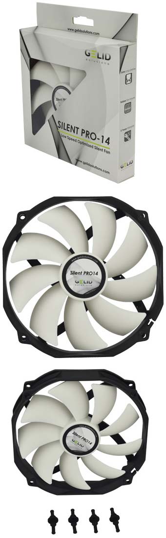 Детище Gelid называется Silent Pro 14, это вентилятор типоразмера 140x140x25мм, подключаемый по 4-пиновому кабелю длиной 500мм, в основе решения гидродинамический подшипник, управление осуществляется по методу ШИМ/PWM. Крепёжные отверстия расположены на расстоянии 105x105мм (как у 120мм вентилятора), скорость вращения лопастей - от 450 до 1500 об/мин, уровень шума - 27.8дБ, статическое давление - 1.86mmAq, воздушный поток - 80.6/137.03 кубических футов в минуту. Лопасти имеют особую оптимизированную форму, лишнего шума вентилятор создавать не должен. На новинку дают 5 лет гарантии, срок службы - до 50000 часов, стоимость - 13 долларов США или же 9.25 евро.