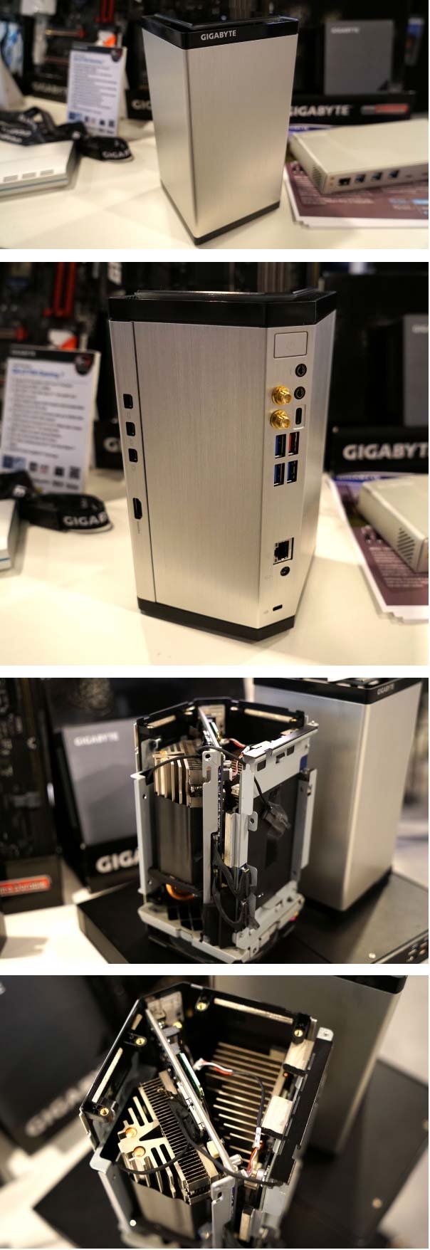 Новый Gigabyte BRIX Gaming UHD (ранее показанный агрегат с тем же именем можно увидеть вот тут) обладает вертикальным исполнением, в верхней части корпуса имеется вентилятор, обдувающим сразу все компоненты компьютера, главным образом - радиаторы процессора и видеокарты.