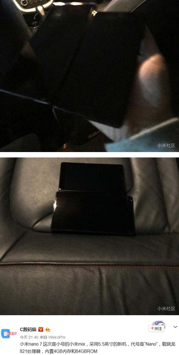 Согласно появившимся данным, Xiaomi хочет явить миру уменьшенный вариант показанного ранее 6.4" гиганта Mi MIX. Устройство может получить имя Mi MIX Nano, при этом обладая 5.5" Full HD экраном. В основе Snapdragon 821, объём оперативной памяти равен 4 гигабайтам, флеш памяти - 64ГБ (будут и другие варианты). Сообщается, что отношение площади экрана к общей площади аппарата составит небывалые 90%, а корпус будет керамическим.