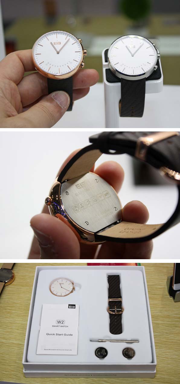 Elephone W2 имеют классический дизайн, круглый циферблат обладает диагональю 1.48 дюйма. Увы, нет данных о "начинке" аппарата, т.е. SoC, объём оперативной и флеш памяти не обнародованы. Известно, что производитель запихал в свои умные часы обычный для такого рода устройств набор сенсоров и датчиков (педометр, G-сенсор, монитор сна и так далее), оснастил батареей на 210 мАч (Maxcell 2032), водонепроницаемым (возможно погружение до 30 метров) корпусом двух цветов и двух типов (Arc edge и Straight Edge), кожаным 22мм ремешком, защитным сапфировым стеклом. Самое занятное то, что у часов механический циферблат (вместо сенсорного экрана), используется швейцарский механизм Ronda 762. Связь со смартфонами осуществляется по Bluetooth, тут никаких сюрпризов.