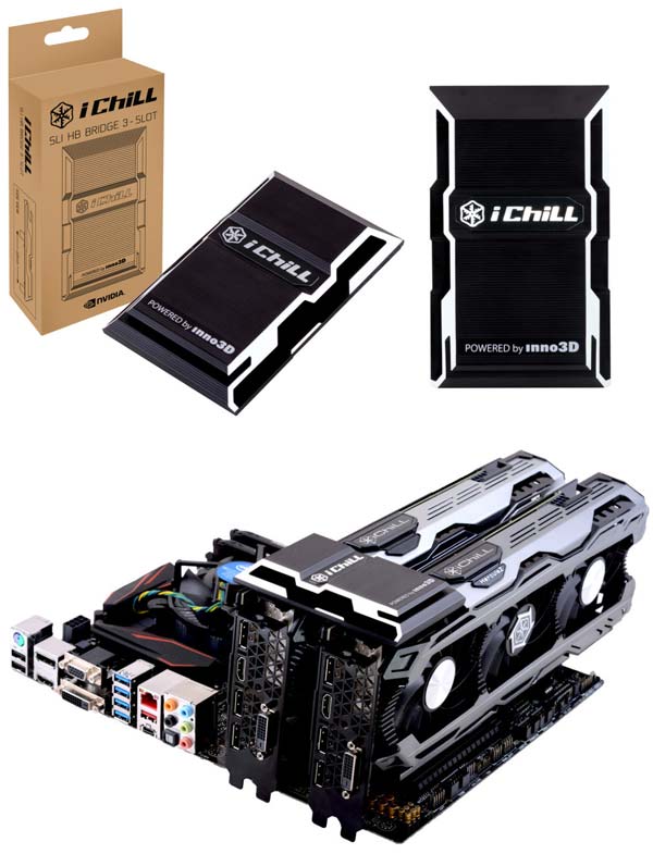 Продукт от Inno3D получил имя iChill SLI-HB, это мостик для SLI соединения между собой видеокарт GeForce последнего поколения (1000-я серия), на базе Pascal. Решение выглядит очень круто по сравнению с обычными мостиками, ибо в нём используется созданная с помощью CNC фрезеровки верхняя алюминиевая крышка с алмазной полировкой поверхности, если я всё правильно понял. Никакой подсветки у новинки нет, совместимость заявлена с карточками GeForce GTX 1080, GTX 1070 и TITAN X Pascal.
