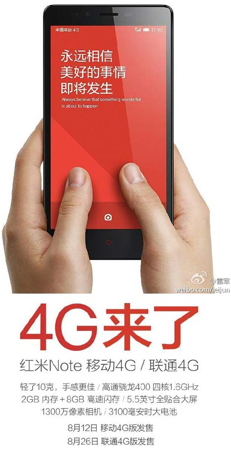 Компания Xiaomi для рынка своей родной страны выпустила новый вариант фаблета Hongmi Note. Аппарат использует Snapdragon 400 (1.6ГГц) и может похвастаться на 10 граммов меньшим весом, чем предшественник, а также поддержкой 4G. Увы, одновременную работу с двумя SIM картами данная модель не поддерживает. Устройство имеет 2ГБ оперативной памяти, 8ГБ памяти встроенной, а также 13МП тыловую и 5МП фронтальную камеры. С 12 августа новинка будет поставляться для клиентов China Mobile, а с 26 для поклонников China Unicom. Цена вопроса - 999 юаней (~5793 рубля).