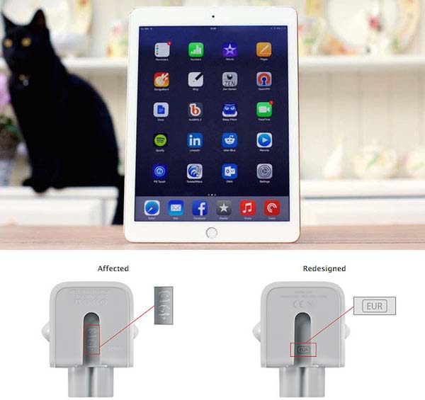 На фото выше показано два адаптера питания - слева бракованный, справа - без изъяна, картинка позволяет понять визуальную разницу между ними. Говорится, что браку подвержены поставляемые с 2003 по 2015 годы за пределы США адаптеры питания для iPad и Mac. Apple предлагает бесплатную их замену всем страждущим, подробности вот тут.