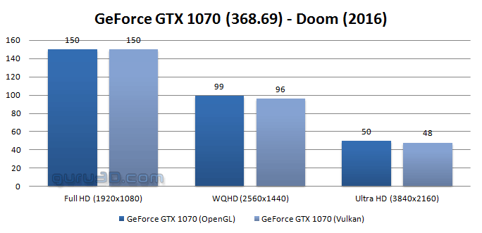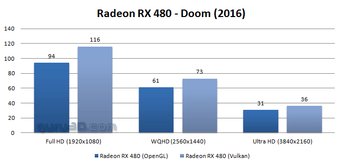 Как известно, на прошлой неделе увидело свет первое обновление для игры Doom, которое привнесло много интересного, в том числе поддержку низкоуровневого API Vulkan. Деятели с сайта Guru3D провели тест на Radeon RX 480 и GeForce GTX 1070, используя последние (т.е. самые новые) на данный момент драйверы для обеих видеокарт. Вот результаты: