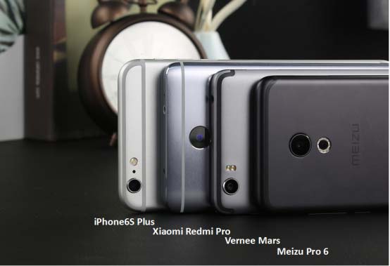 А вот присланные из Vernee фото-материалы, наглядно демонстрирующие нам малые размеры 5.5" фаблета Mars относительно других популярных аппаратов с такой же (в большинстве случаев) диагональю экрана: