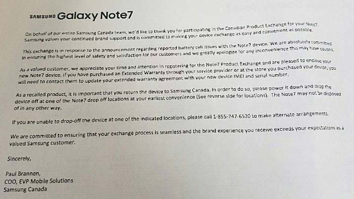 Смысл речи в том, что все Galaxy Note7 подлежат замене, а если устройством не пользуются, его лучше выключить. В Канаде народ уже начал получать лишённые описанного недостатка устройства, коробки выглядят так: